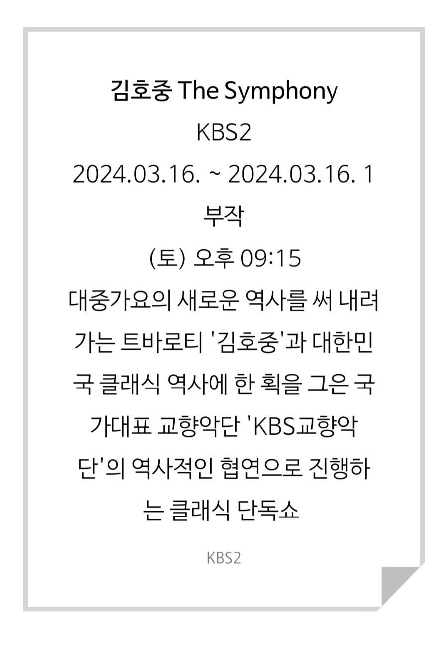 한편, 김호중의 클래식 단독쇼 ‘더 심포니’는 2일 오후 7시 30분 서울 여의도 KBS홀에서 열리며, 오는 16일 오후 9시 15분 KBS2 ‘김호중 The Symphony’로 만나볼 수 있으니 참고하시면 됩니다.